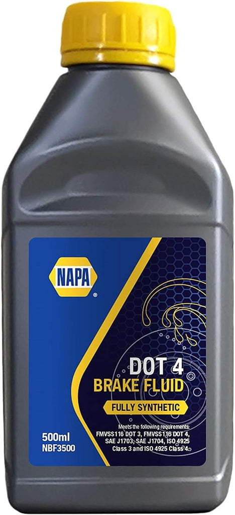 Napa DOT 4 Brake Fluid is a high quality, fully synthetic brake and clutch fluid that has been specially formulated to protect components and allow optimal performance of anti-lock braking systems (ABS) in today’s vehicles. Recommended for use in hydrAUlic brake and clutch systems of all cars, commercial vehicles and motorcycles which require a glycol-based DOT 3 or DOT 4 fluid. Dry Boiling Point: 243°C Wet Boiling Point: 159°C This oil can be safely mixed with other DOT 3 and DOT 4 approved fluids. Benefits: Provides protection and optimal performance Suitable for all vehicles where a DOT 3 or DOT 4 fluid is specified Contains excellent wear-reducing and lubricating properties to increase the Life of components Provides corrosion protection for metal components Outstanding wet & dry boiling points Conforms to and exceeds the current international specifications: FMVSS No.116 DOT 4 and DOT 3 SAE J1703 and J1704 ISO 4925 (Classes 3 & 4)