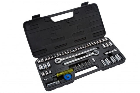 The BlueSpot 52 Piece Socket Set is chrome plated and drop forged for increased durability. Includes sturdy plastic case for quick and convenient storage.Chrome plated and drop forged for increased durabilityIncludes sturdy plastic case for quick and convenient storage.Package Contents1/2" Drive Reversible Ratchet Handle. 3/8" Drive Reversible Ratchet Handle. 3" Extension Bar. 1/4" Drive Spinner Handle. 1/4" M x 3/8" F Adapter. 3/8" Drive Spin Disc. 1 Coupler. 21mm Spark Plug Socket. Phillips Bits: No 1, 2 & 3. Standard Bits: 3/6" & 9/32". 3/8" Drive 6pt. Sockets: 7/16", 9/16" & 1/2". 3/8" Drive 8pt. Sockets: 1/4", 5/16" & 3/8". 1/2" Drive 6pt. Sockets: 5/8", 11/16", 3/4" & 13/16". 1/4" Drive 6pt. Sockets: 5/32", 3/16", 7/32", 1/4", 9/32", 5/16", 3/8", 13/32", 7/16", 15/32" & 1/2". 3/8" Drive 6pt. Sockets: 11, 12 & 13mm. 1/4" Drive 6pt. Sockets: 4, 4.5, 5, 5.5, 6, 6.5, 7, 8, 9, 10, 11, 12 & 13mm