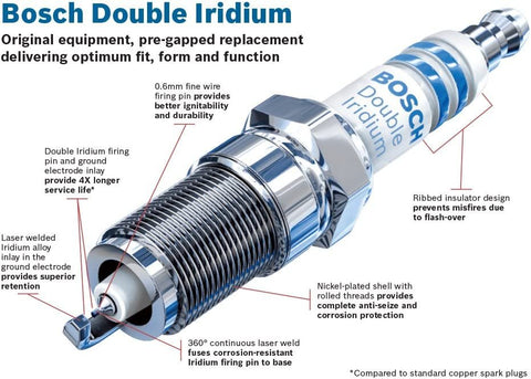 Bosch Double Iridium Spark Plugs are engineered to deliver both high performance and long life, representing the best of OE spark plug technology. The ultra-fine wire design and laser welded tapered ground electrode deliver optimum performance, while the iridium center electrode and ground electrode help it to go the distance. Unlock the performance in your engine with Bosch Double Iridium Spark Plugs.