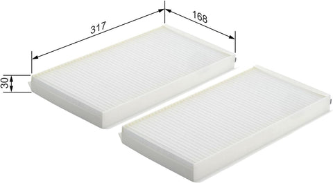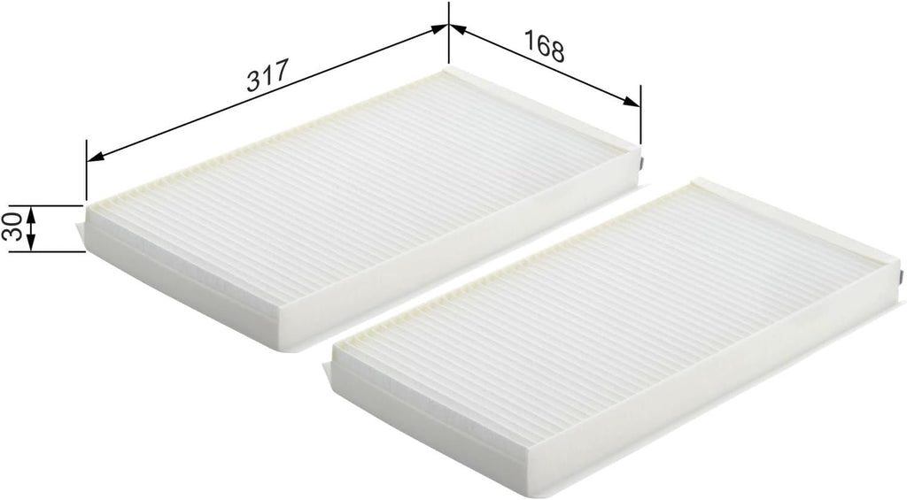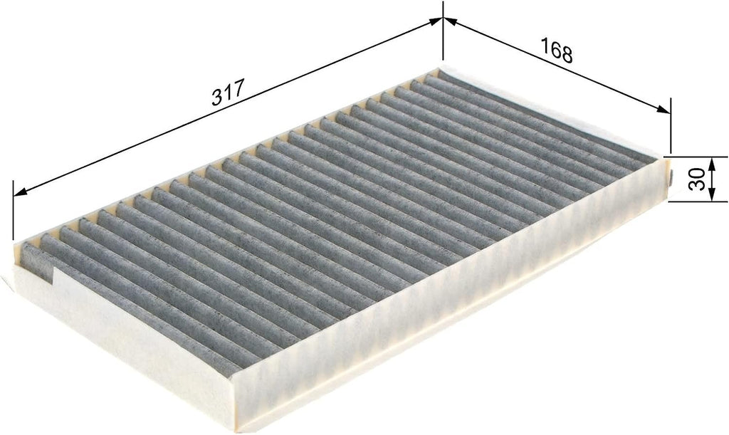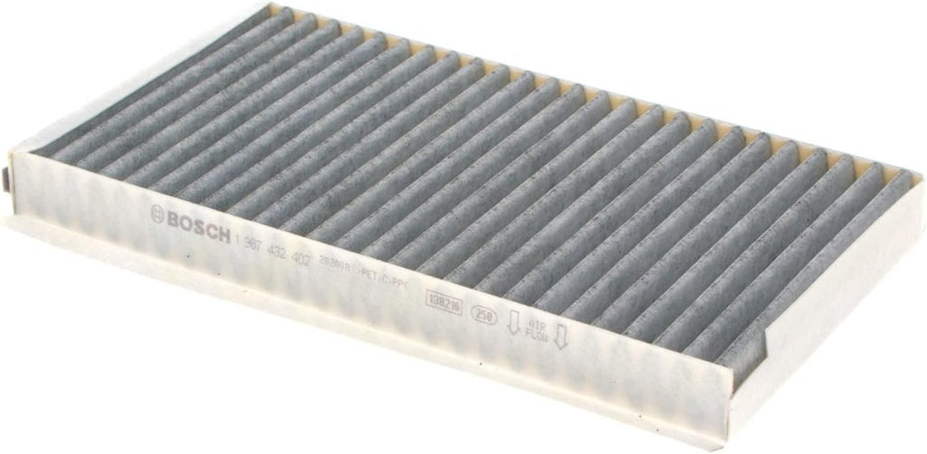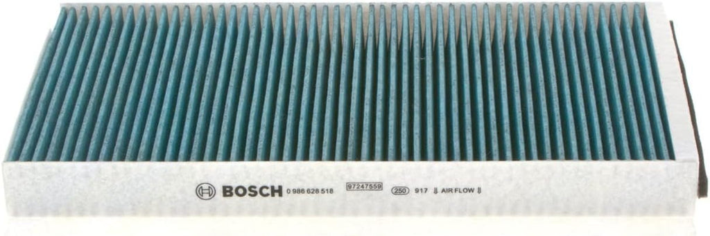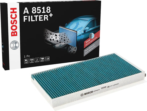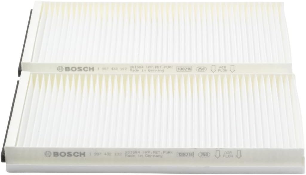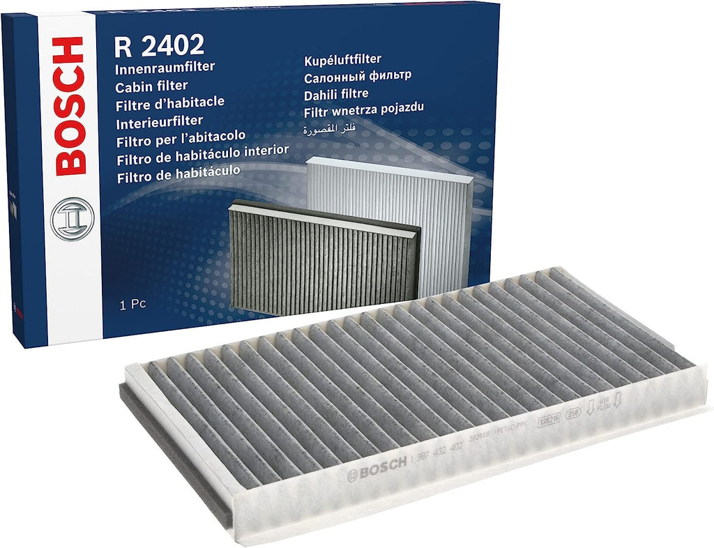 Bosch offers one of the world's largest ranges of spare parts for vehicle repair. The focus thereby is on high quality and a long product life. This helps to keep people mobile all over the world.For more than 130 years, Bosch has pursued the goal of offering intelligent and reliable solutions to make life a little bit easier every day.Cabin FilterPrincipal featureAction against bad smellsAction against allergensProtects from fines particles (up to 99% of PM2✓Neutralizes allergens and bacterias✓Protects from smells✓✓Protects from harmful gaz✓✓Protects from pollen and fine particles (up to 100% of PM10✓✓✓Protects the air conditioning system✓✓✓Reduces the mist effect on the windshield✓✓✓The fine particles… ExplainationsPM10: Fine particles up to 10 micrometers Penetration: bronchi Adapted filters: Standard & Active CarbonPM2,5: Fine particles up to 2,5 micrometers Penetration: Pulmonary alveoli Adapted filters: FILTER+Bosch recommends to replace the cabin filter every 15 000 kilometers or once a year.FILTER+, a PLUS for:Your HEALTH: Cabin filter against allergens, particles, pollen, gases and bacteria.Your COMFORT: effective against smells.Your SECURITY: The carbon filter reduces the risk of allergic reactions.Your VECHICLE: reduction of deposits in your ventilation system for a reduction of break downs.Your HEALTH: Cabin filter against allergens, particles, pollen, gases and bacteria.Your COMFORT: effective against smells.Your SECURITY: The carbon filter reduces the risk of allergic reactions.Your VECHICLE: reduction of deposits in your ventilation system for a reduction of break downs.