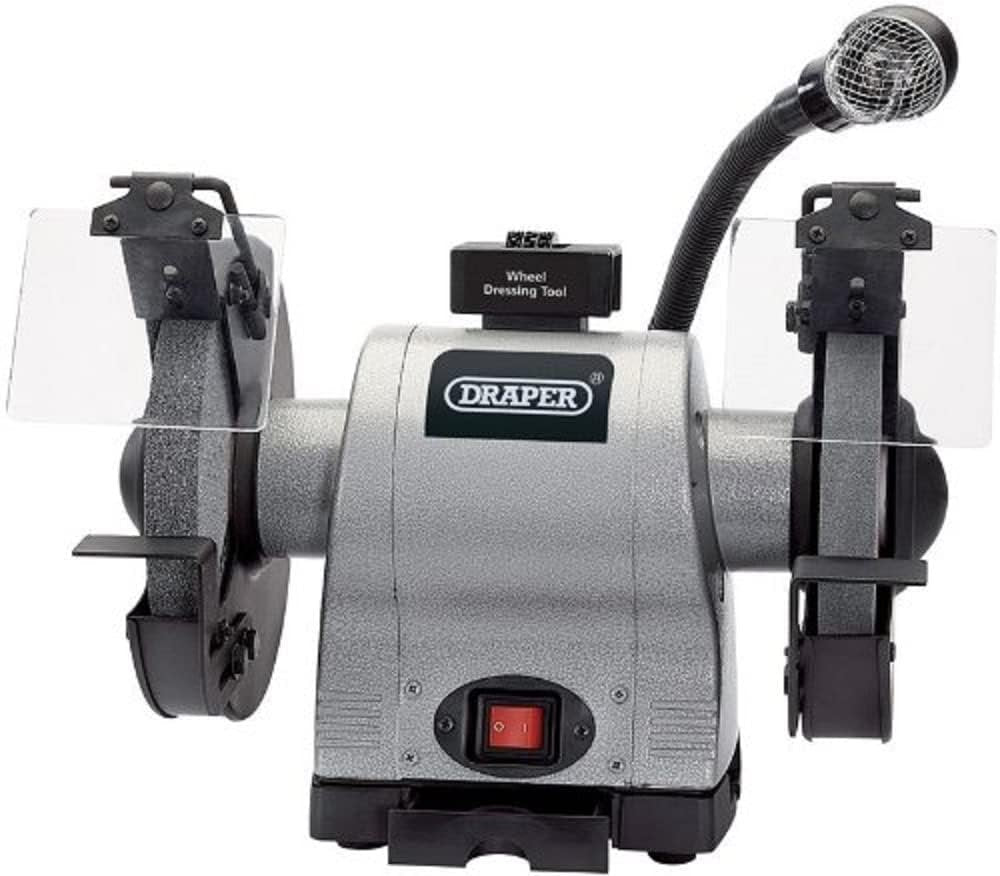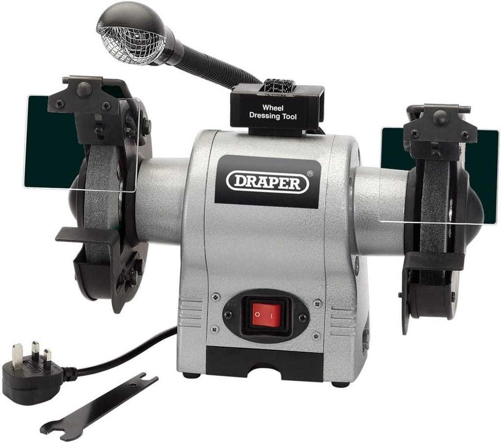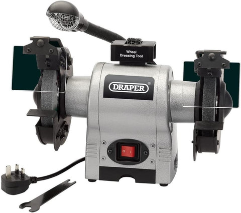 This Bench Grinder from Draper is a workshop machine with one coarse and one fine grinding wheel, worklight, adjustable eye protection shields, spark deflectors, wheel guards and tool rests. Supplied with grinding wheel dresser and storage tray. Fitted with approved plug and cable.