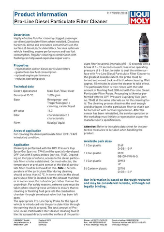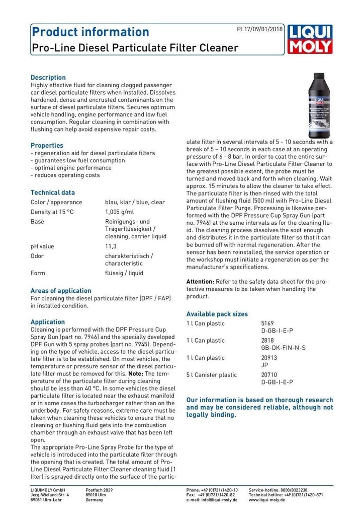 BRAND NEW TO RANGEDPF CLEANERLIQUI MOLYFor passenger car diesel engines with diesel particulate filter (DPF/FAP). Special short-distance vehicles and city vehicles are primarily affected by problems with clogged diesel particulate filters. Highly effective fluid for cleaning clogged passenger car diesel particulate filters when installed. Dissolves hardened, dense and encrusted contaminants on the surface of diesel particulate filters. Secures optimum vehicle handling, engine performance and low fuel consumption. Regular cleaning in combination with flushing can help avoid expensive repair costsTHE PARTS LISTED IS THE EXACT ITEM YOU ARE BUYINGPLEASE CALL OR EMAIL FOR ANY INFORMAION