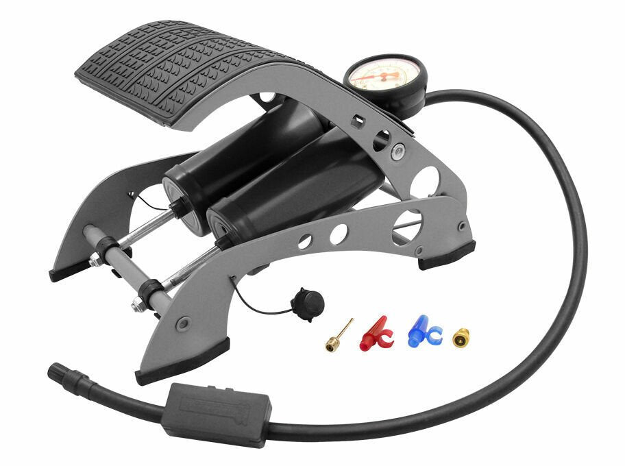 NEW TO RANGE1 MICHELIN Twin Barrel Foot Pump Features: Ergonomic Tread Plate.Superior Performance to 100psi.Stylish, Functional Design.60cm Hose for easy connection to tyre valve.Adaptors for Cycles, Sports Equipment and Beach Toys.Accurate Analogue Gauge and easy to read dual display shows PSI and BAR.THE PICTURE SHOWN IS THE EXACT ITEM YOU ARE BUYING