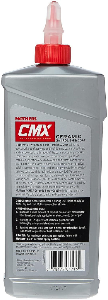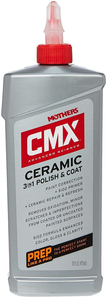 Mothers CMX Ceramic 3-in-1 Polish & Coat takes the guesswork out of applying and maintaining ceramic coatings and can be used at all stages of the ceramic coating process. From pre-coat paint correction to priming your paint for ceramic application or even to repair and refresh an existing coating, this 3-in-1 formula does it all. Cutting-edge abrasives quickly remove imperfections on any coated or uncoated painted surface, while laying down an acrylic-Si02 ceramic foundational primer layer for optimal coating adhesion and a lasting bond. Best of all, this formula does not contain waxes or oils that negate surface adhesion so coatings can be applied immediately after use. Use independently or follow with Mothers CMX Ceramic Spray Coating to further enhance your paint’s colour, gloss, clarity and ceramic protection.
