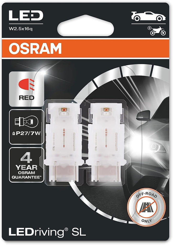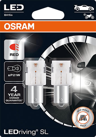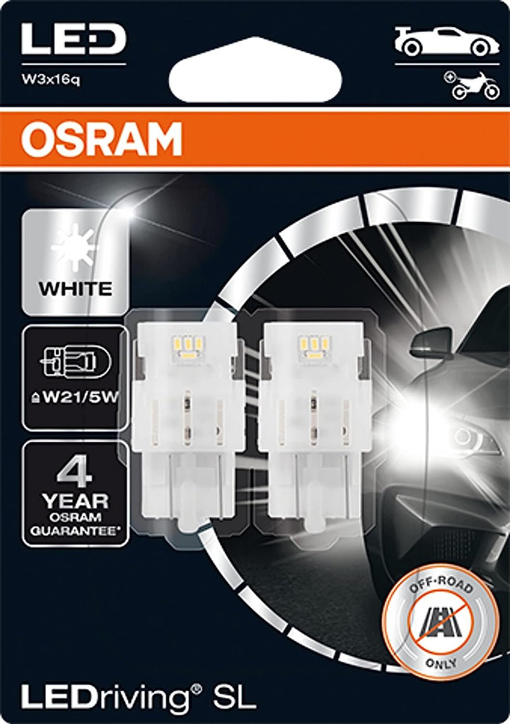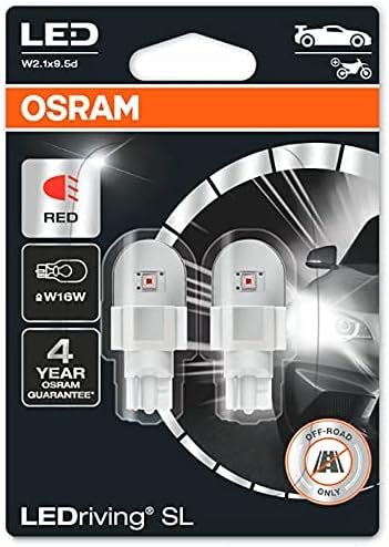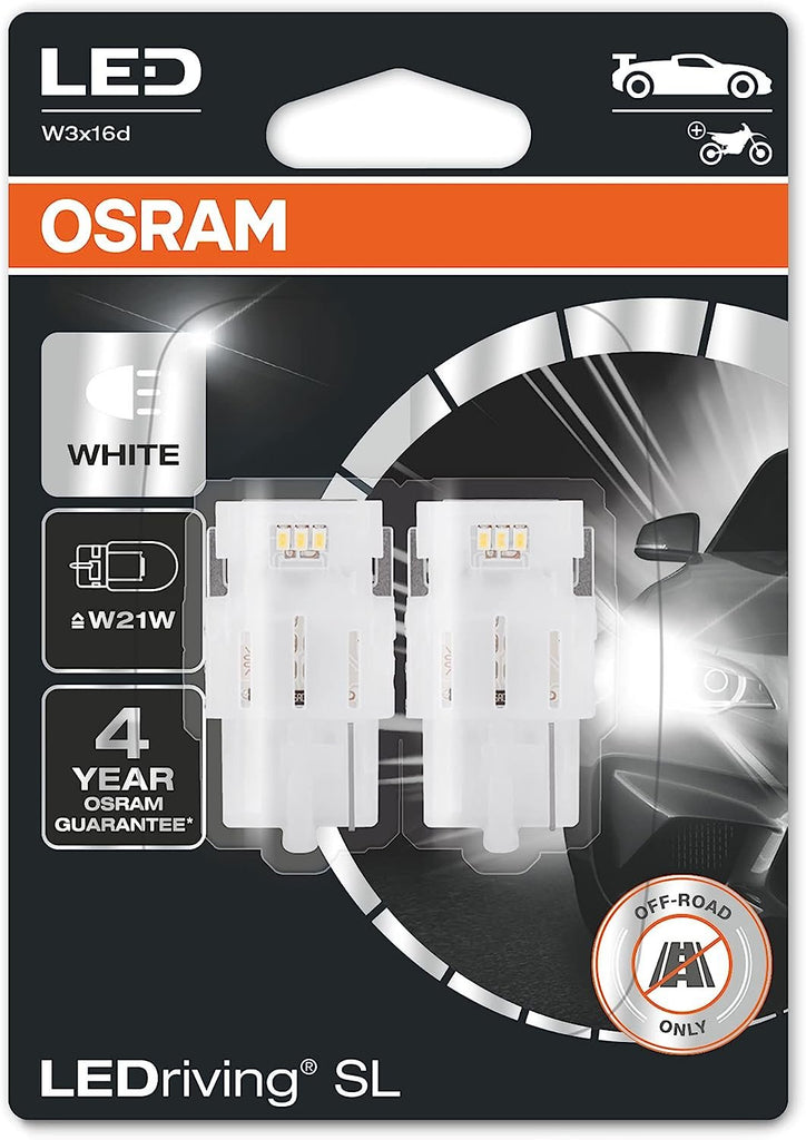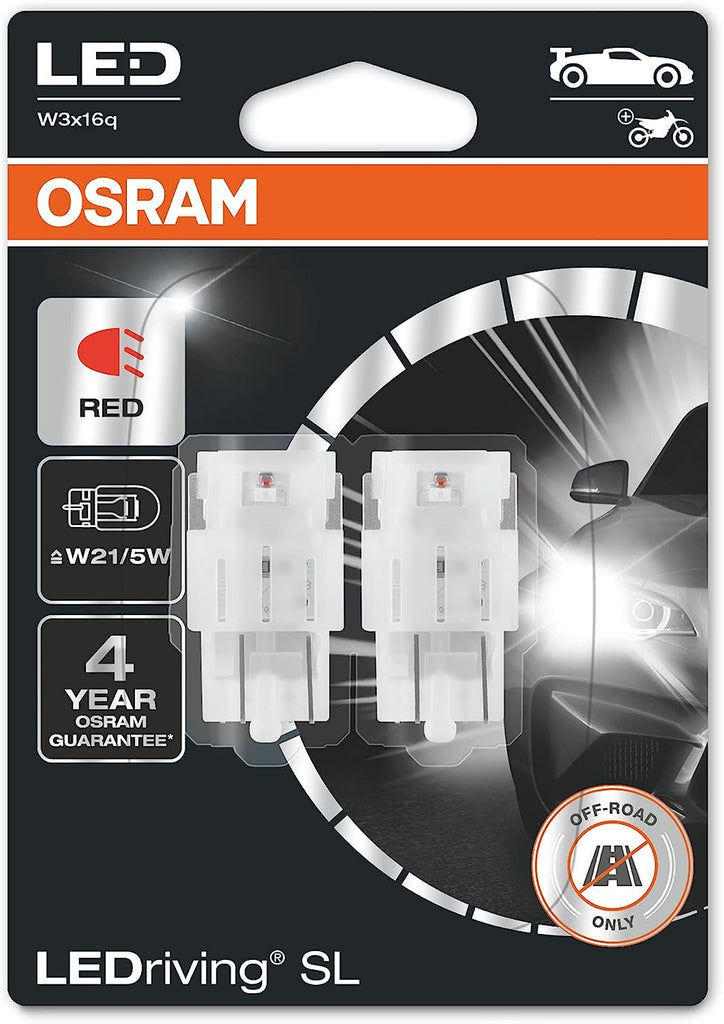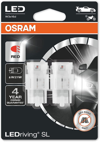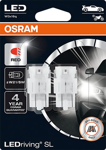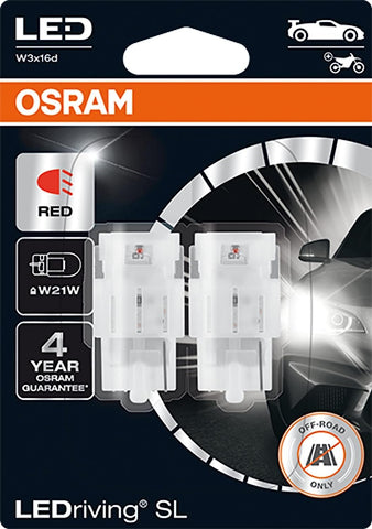 Modern and intense LED light available in Red. The OSRAM LEDriving SL portfolio combines premium quality of the latest LED technology for a competitive price. In addition, OSRAM LED replacement lamps offer a modern and intense LED light with red color temperature. These LED signal lamps replace conventional W16W lamps as easy plug-and-play solution for various vehicle applications. In comparison to standard lamps, LED retrofit lamps have a quicker light up. Meaning faster signals provide more reaction time for drivers behind you. On top OSRAM offers a 4 year guarantee for these LEDriving SL lamps. These products do not have ECE approval and must not be used on public roads in any exterior application. Public roads use leads to cancellation of operating license and loss of insurance coverage. Several countries forbid sale and use of these products. Please contact your local distributor for further information.. Tail light. These products do not have ECE approval and must not be used on public roads in any exterior application. Public roads use leads to cancellation of operating license and loss of insurance coverage. Several countries forbid sale and use of these products. Please contact your local distributor for further information