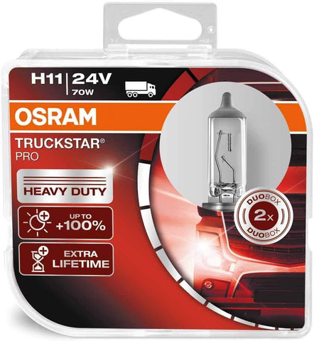Discover TRUCKSTAR PRO - the brightest truck light from OSRAM. With up to 100% more light than standard lamps, extremely long life and very high vibration resistance these 24 volt lamps are ideal for professional drivers while reducing downtime and fleet costs. Thanks to the high vibration resistance, TRUCKSTAR PRO lamps are suitable even for heavy-duty applications. Due to their impressive brightness and more than double the service life compared with standard lamps, the lamps improve your safety while driving on the road.