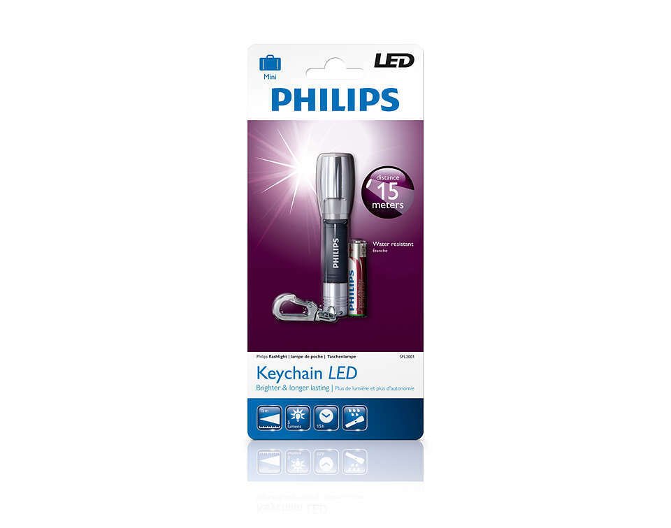 Philips SFL2001 Flashlight Keychain LED 1xAAA 15 Meters DistanceThis mini and compact metal Keychain LED is the perfect on-the-go torch! Made with high-quality aluminium, each Keychain LED is filled with lighting technology for optimal use. Compact practical flashlight for every opportunity.- 5 Lumens light output, 50 feet beam range, 15 hours runtimes- Up to 5 times brighter- Battery life last up to 10 times longer- LED's last up to 50,000~100,000 hours- Heat, cold and shock resistant- Product Dimensions: 0.1 x 0.1 x 0.4 inches ; 1 ounces