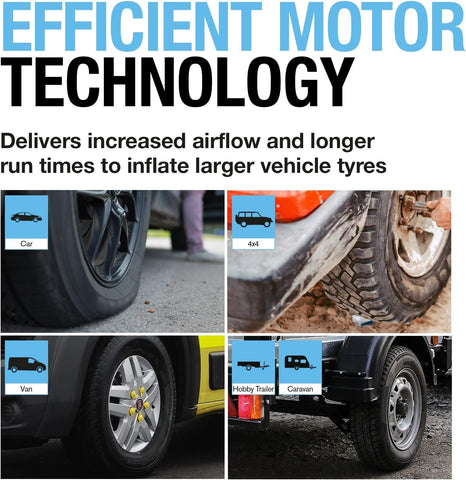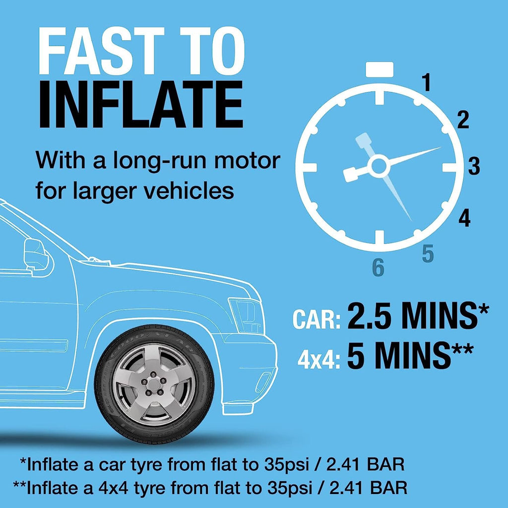 The RAC820 can inflate a car tyre to 35PSI from flat in under 2.5 minutes – and a 4x4 tyre in under 6 minutes.