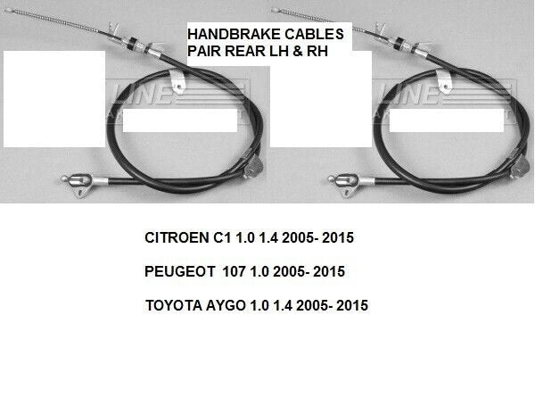 BRAND NEW PARTYOU ARE BUYING REAR PARKING HAND BRAKE CABLE1X REAR LH1X REAR RHTO FIT THE FOLLOWINGCITROEN C1 TOYOTA AYGO PEUGEOT 107 2005-2015 THE PICTURE SHOWN IS THE EXACT ITEM YOU ARE BUYINGIF YOU ARE UNSURE ABOUT FITTMENT PLEASE EMAIL YOUR REG NUMBER